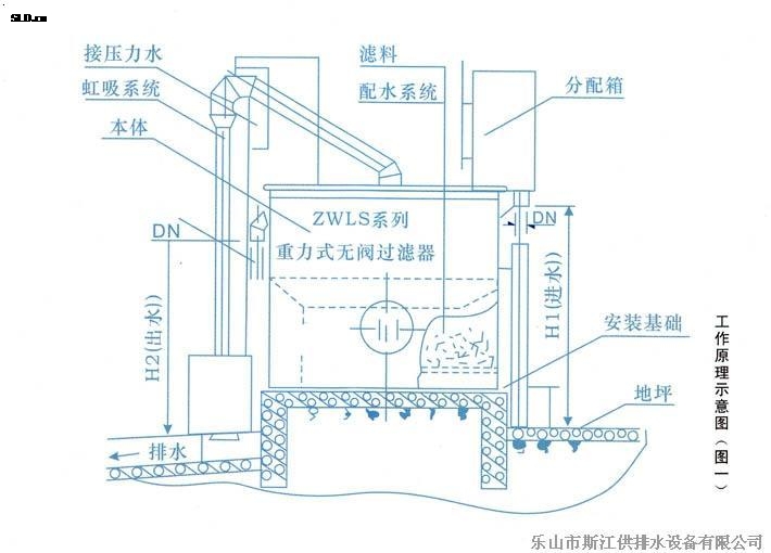 原水不斷自進(jìn)水管進(jìn)入虹吸上升管在輔助虹吸管的管口處,進(jìn)入輔助虹吸管并沿該管下跌,在下跌過程中通過“抽氣三通”,并帶走“抽氣三通”側(cè)管內(nèi)的空氣,而“抽氣三通”側(cè)管是連接虹吸管系統(tǒng)倒置U型管頂部的,這樣,“抽氣三通”就抽吸了虹吸管系統(tǒng)倒置U型管頂部和虹吸下降管內(nèi)的空氣,由于虹吸下降管的下部管口在排水水封內(nèi)被水封住管口,于是倒置U型管頂部及虹吸下降管內(nèi)逐漸形成負(fù)壓,并且真空度逐漸增大,水封內(nèi)的水在虹吸下降管的液面從“反沖洗前,管內(nèi)最低水位”迅速上升,并越過倒置U型管頂部,與虹吸上升管內(nèi)的原水匯合,形成虹吸,原水沿虹吸下降管下跌,于是反沖洗開始了,清水自清水區(qū)沿?cái)?shù)條連通管,清水管由上而下進(jìn)入集水區(qū),從集水區(qū)通過網(wǎng)板、承托層,自下而上反沖濾料,使濾層處于膨脹,濾料相互摩擦、碰撞狀態(tài),被截留和吸附在濾料層內(nèi)的懸浮物等污物隨水流通過渾水區(qū),進(jìn)入虹吸管系,沿虹吸上升管,虹吸下降管進(jìn)入排水水封井,流至下水管網(wǎng)。在反沖洗過程中,清水區(qū)內(nèi)的水面迅速下降,同一體相隔的另一室的清水,進(jìn)入正在反沖洗的一室內(nèi),參與反沖洗,以保證足夠的沖洗時間。當(dāng)清水區(qū)內(nèi)的水面降至虹吸破壞斗管口時,空氣自虹吸破壞斗的管口進(jìn)入倒置U型虹吸管系的頂部,于是虹吸被破壞,虹吸管系內(nèi)的反沖洗水?dāng)嗔鳎礇_洗結(jié)束。同時,處于膨脹狀態(tài)的濾料層的濾料下落,原水仍進(jìn)入渾水區(qū),經(jīng)濾料層,開始了又一個周期的過濾。如此周而復(fù)始地過濾,反沖洗,過濾……